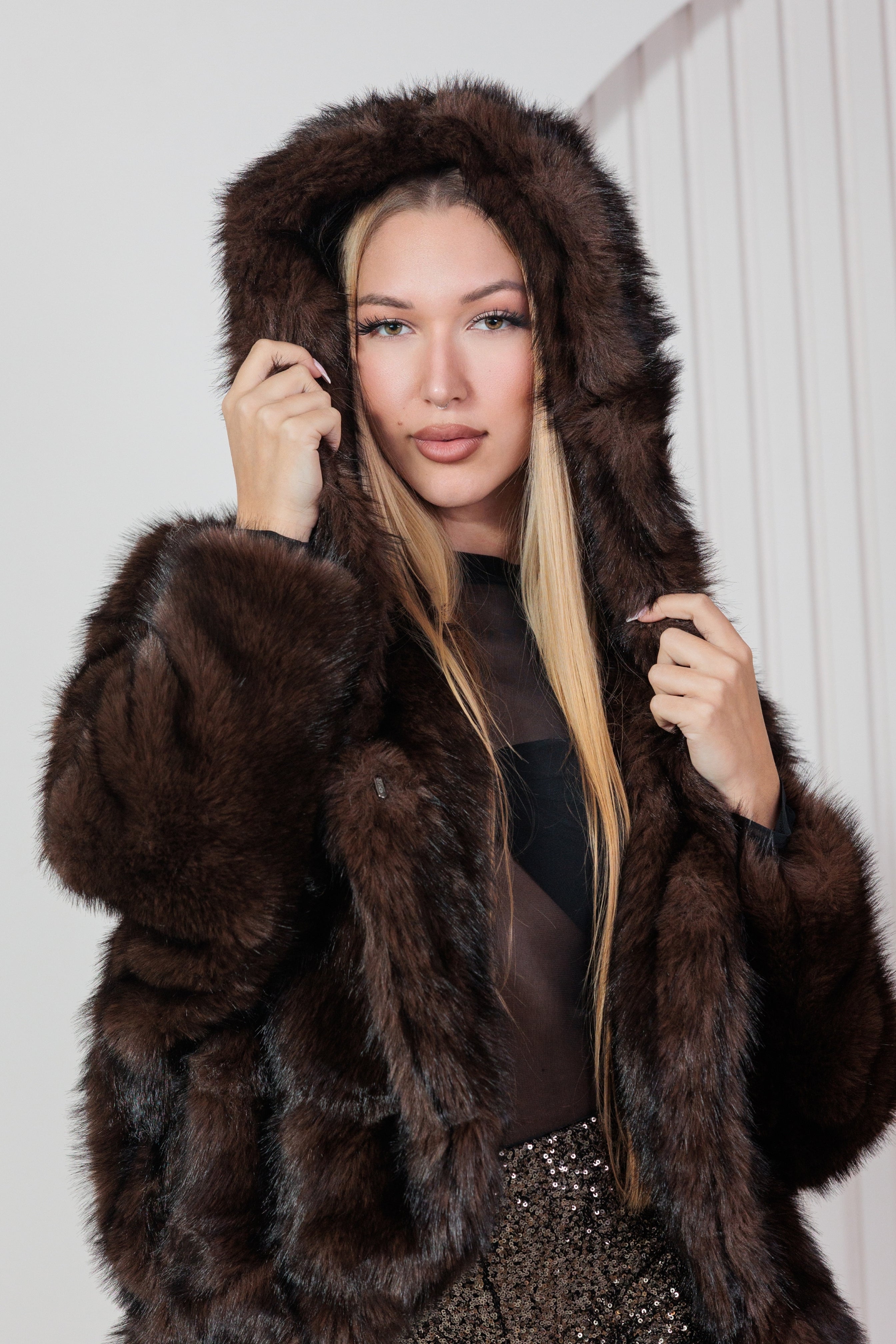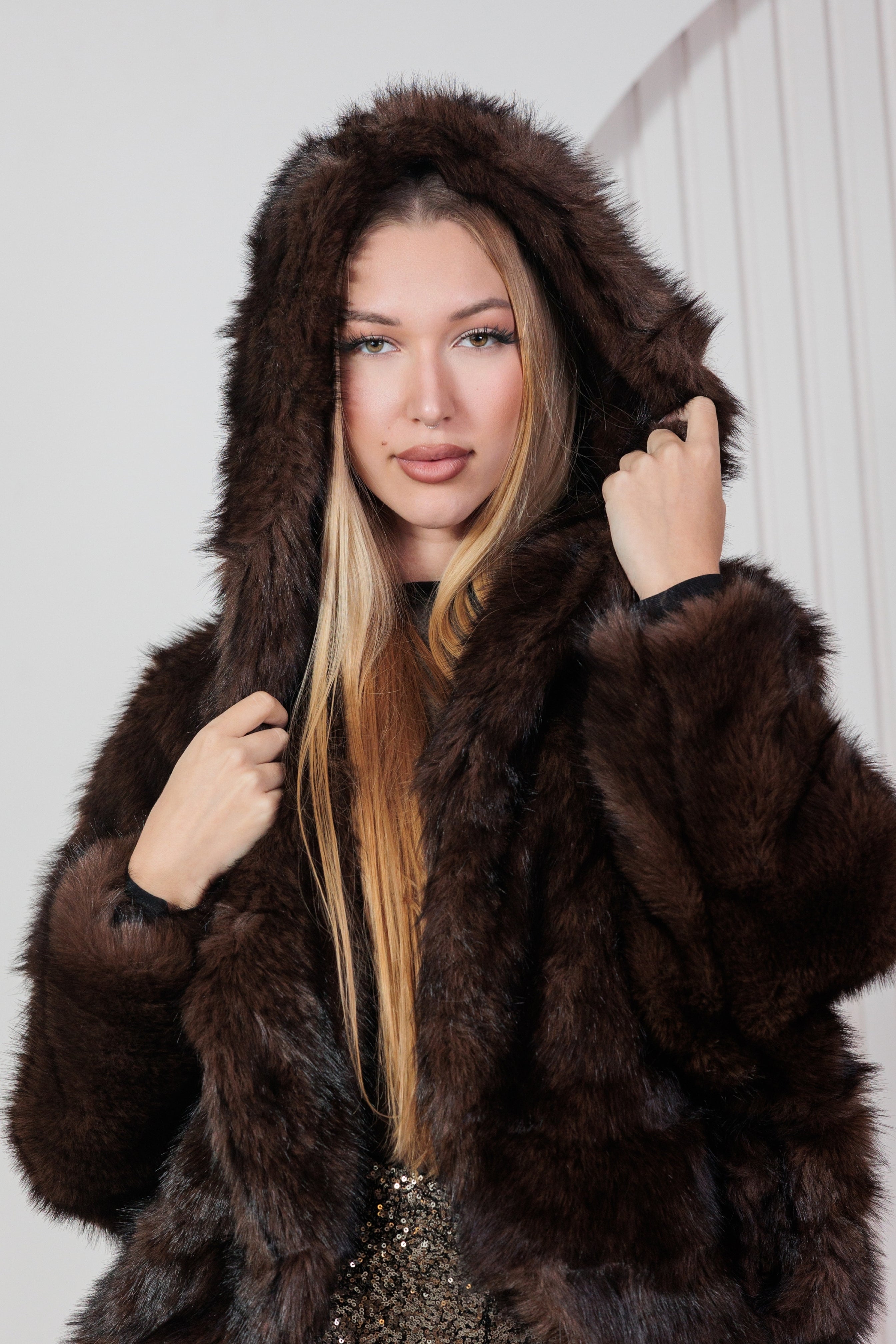 Chaqueta estilo pelo con capucha, una prenda súper tendencia esta temporada. Su diseño con efecto solapa aporta un acabado moderno, calentito y muy estiloso, perfecto para completar cualquier look invernal con un toque chic.