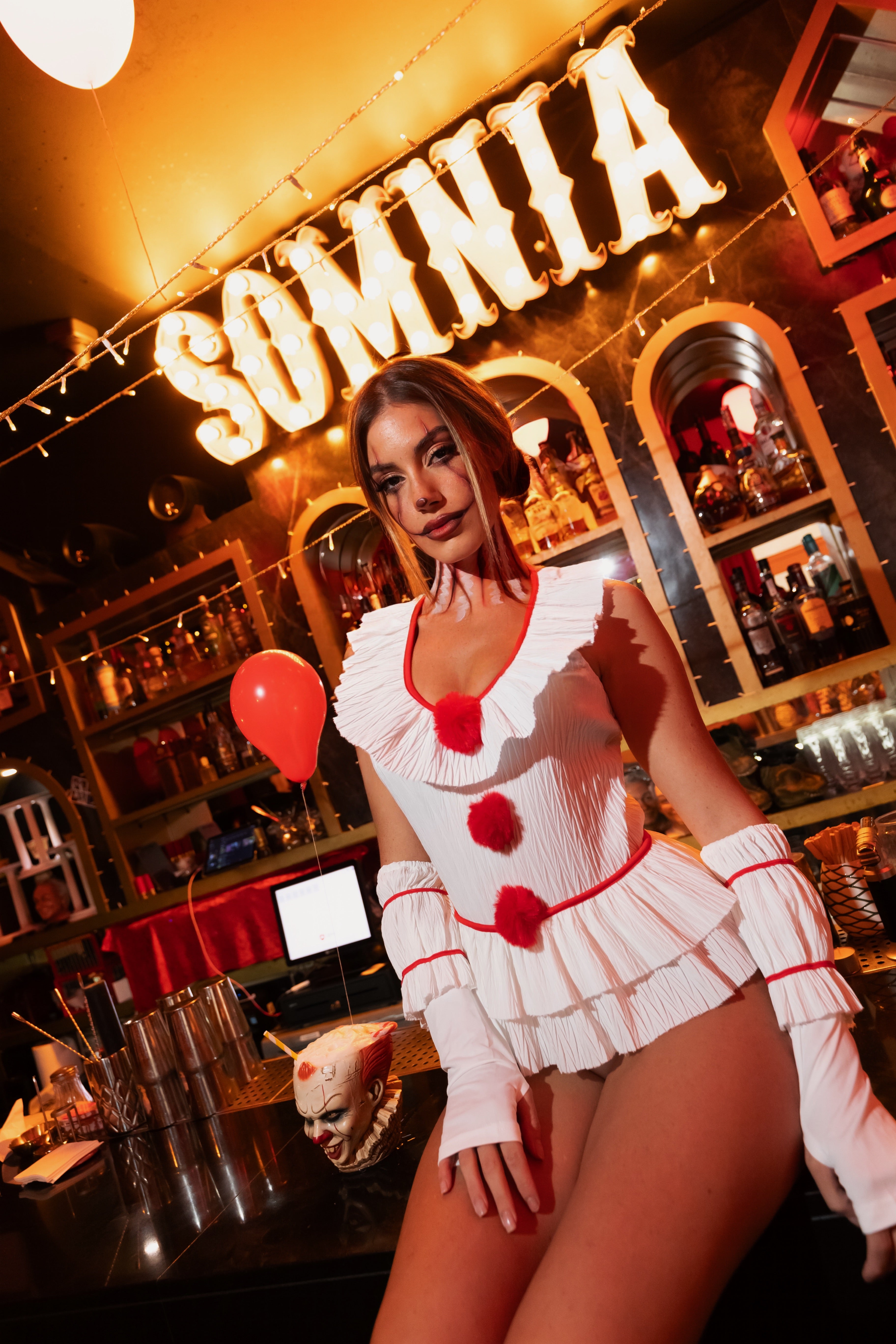 El escote profundo con borde rojo aporta un toque provocador, equilibrado con el maquillaje oscuro y teatral que completa el look. Inspirado en el icónico Pennywise, este atuendo combina el terror con un aire sexy y festivo, perfecto para destacar en cualquier celebración nocturna.