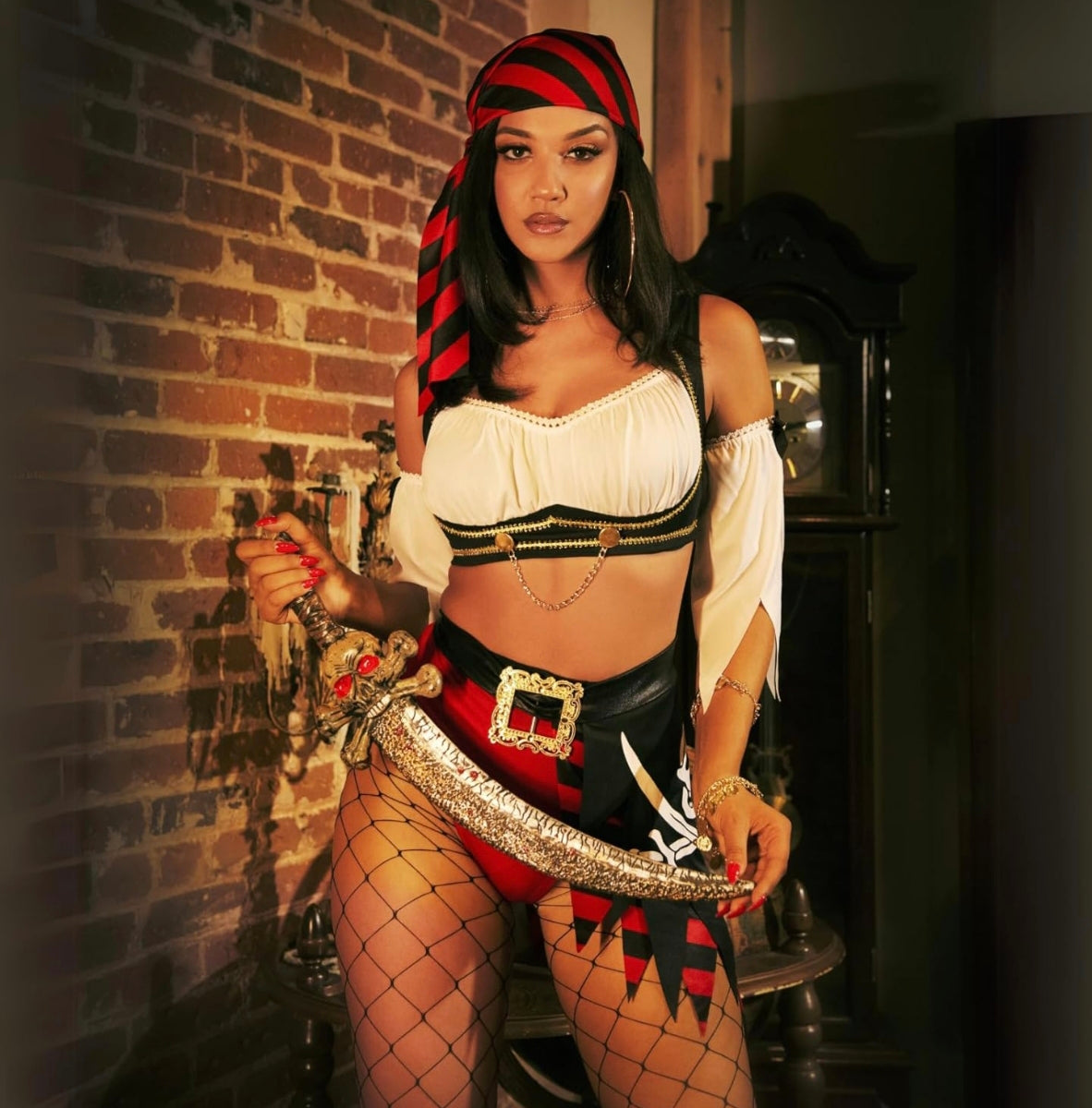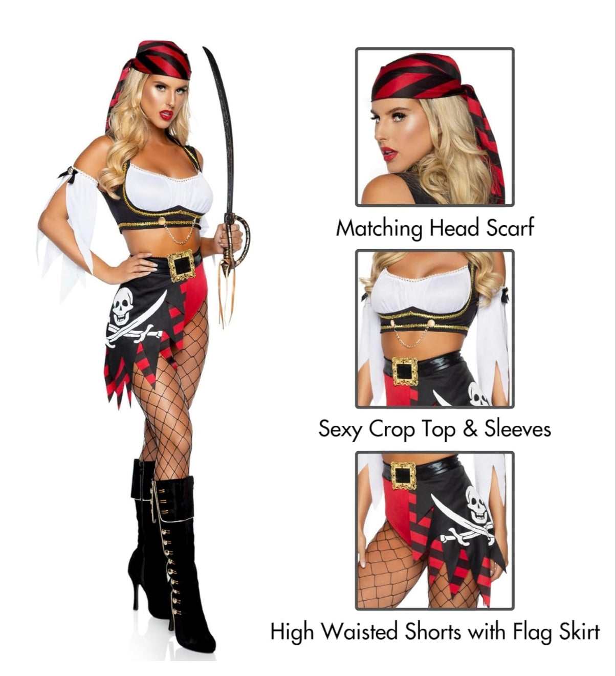 - Incluye pañuelo, guantes laterales, cinturón y medias.