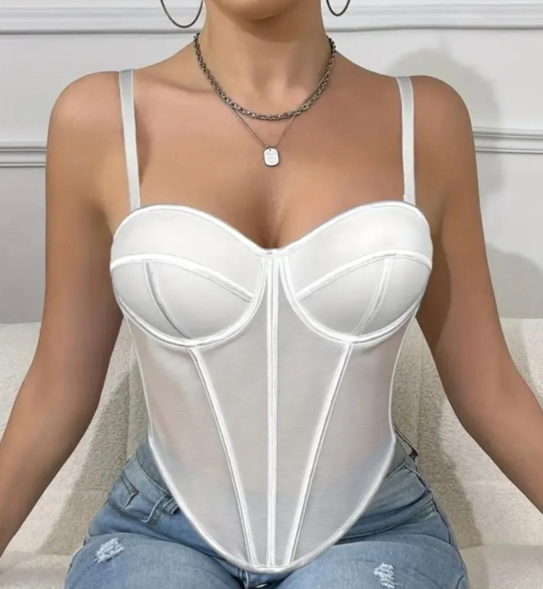 Elaborado en tejido blanco satinado con paneles de malla translúcida que aportan un toque moderno y sensual.
